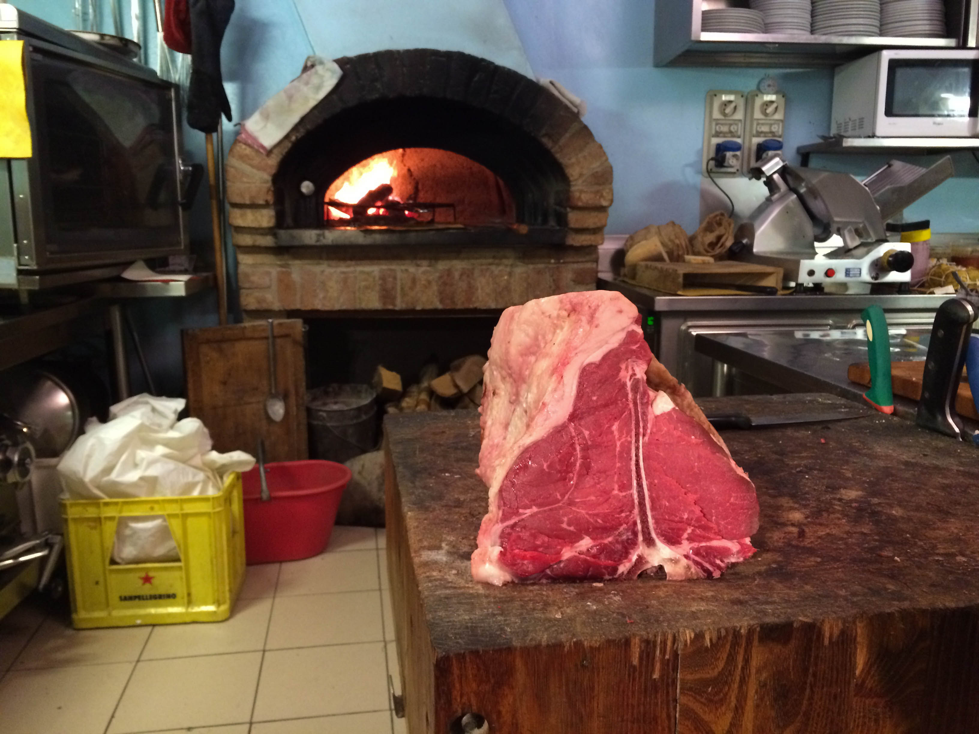 Wax has a family friend living at Castiglione del Lago. So he was our first stop for a few nights on the border of Umbria and Tuscany. It was a great base to explore from and we made the most of it. We were walking through the gorgeous Montepulciano around midday and a noticed a group of people outside a restaurant. When we got home a bit of internet research convinced us that it was most definitely a good idea to book a table there the following evening to experience the finest Bistecca Fiorentina in the area. We rolled up the next night for this legendary steak and it was out of this world. The place was full, they had two long tables either side of the room with just enough aisle space to carry gigantic plates of steak. Pride of place in the kitchen were 2 huge joints of Chianina beef, T-Bone or sirloin sitting atop a very solid wooden table. Behind it was a blazing hot wood oven with a cast iron grill stand inside. The waiters came to the table asked what cut you would like and how many kilos (minimum order 1.3) and what sides you desired. The boss then cut off your steak, had the waiter show it to you and then it was charred briefly in the searing hot fire. It was phenomenal, very rare but warmed right through from hours of sitting out at room temperature (this is a very important part of meat cookery, meat needs to be at least at room temperature when you cook it, unless you want it well done… then it doesn’t matter). For sides we had dandelion salad, roast fennel and truffled creamed potatoes. Dessert consisted of roast pecorino with pears and roast pecorino with truffles. Are you hungry?