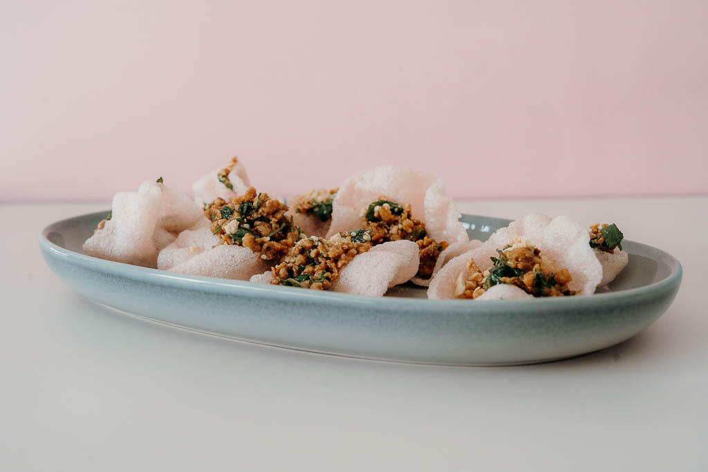 Chicken, hoisin, mint, peanuts + prawn cracker DF