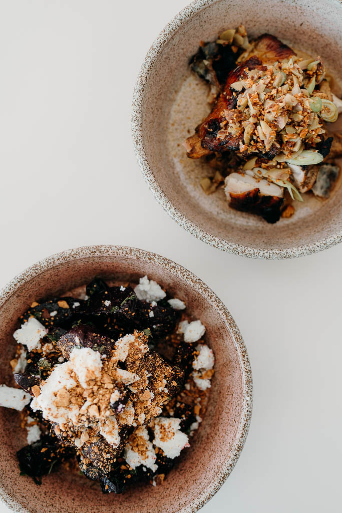 Beetroot, goats curd, parsley + roast almond GF