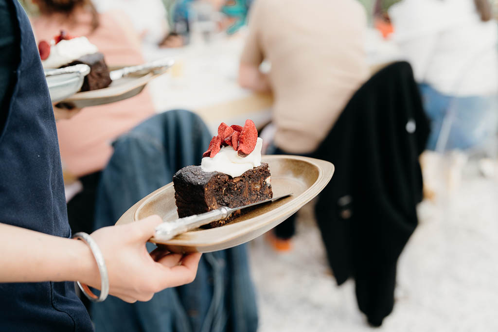 Triple choc salted caramel brownie, mascarpone cream + plum GF
