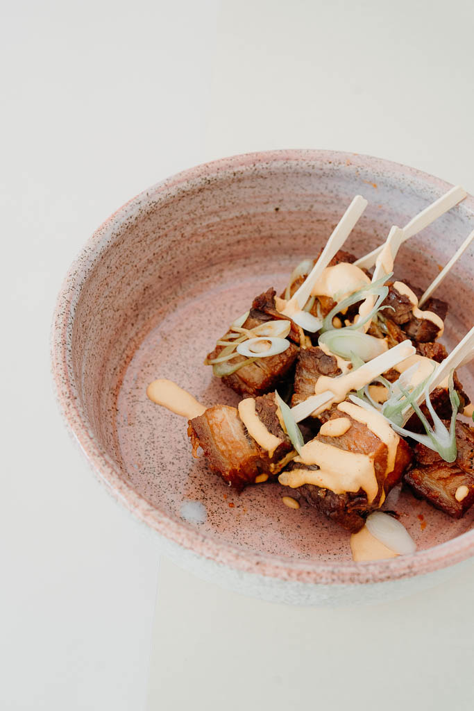 Crispy pork belly, spring onion, gochujang + kimchi mayo DF