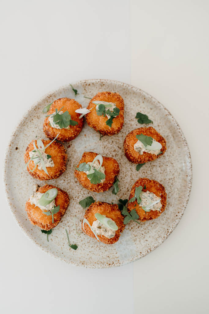 Prawn toast, sriracha tartare + herbs