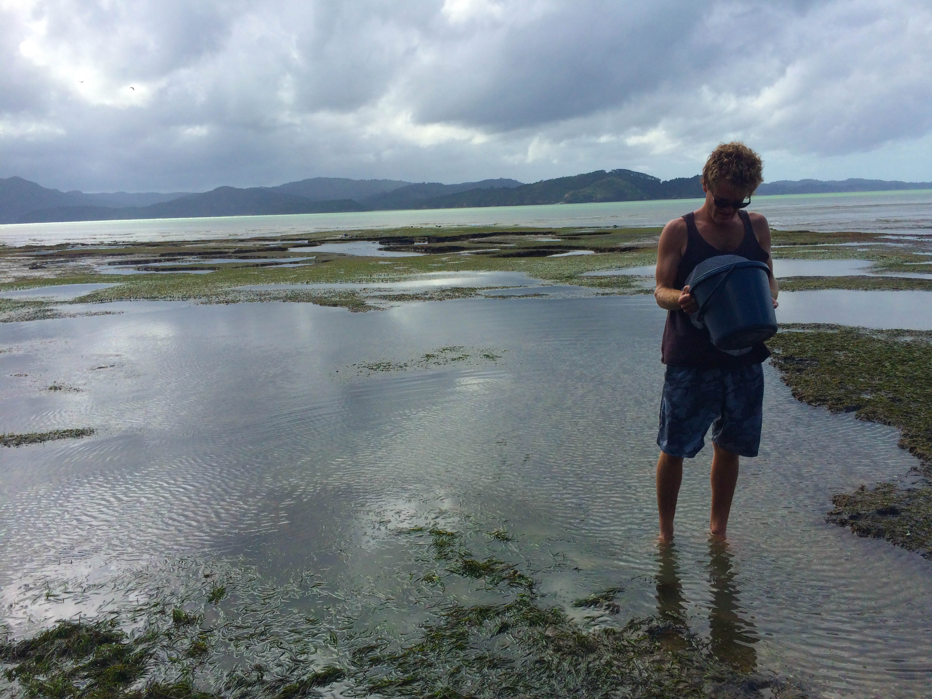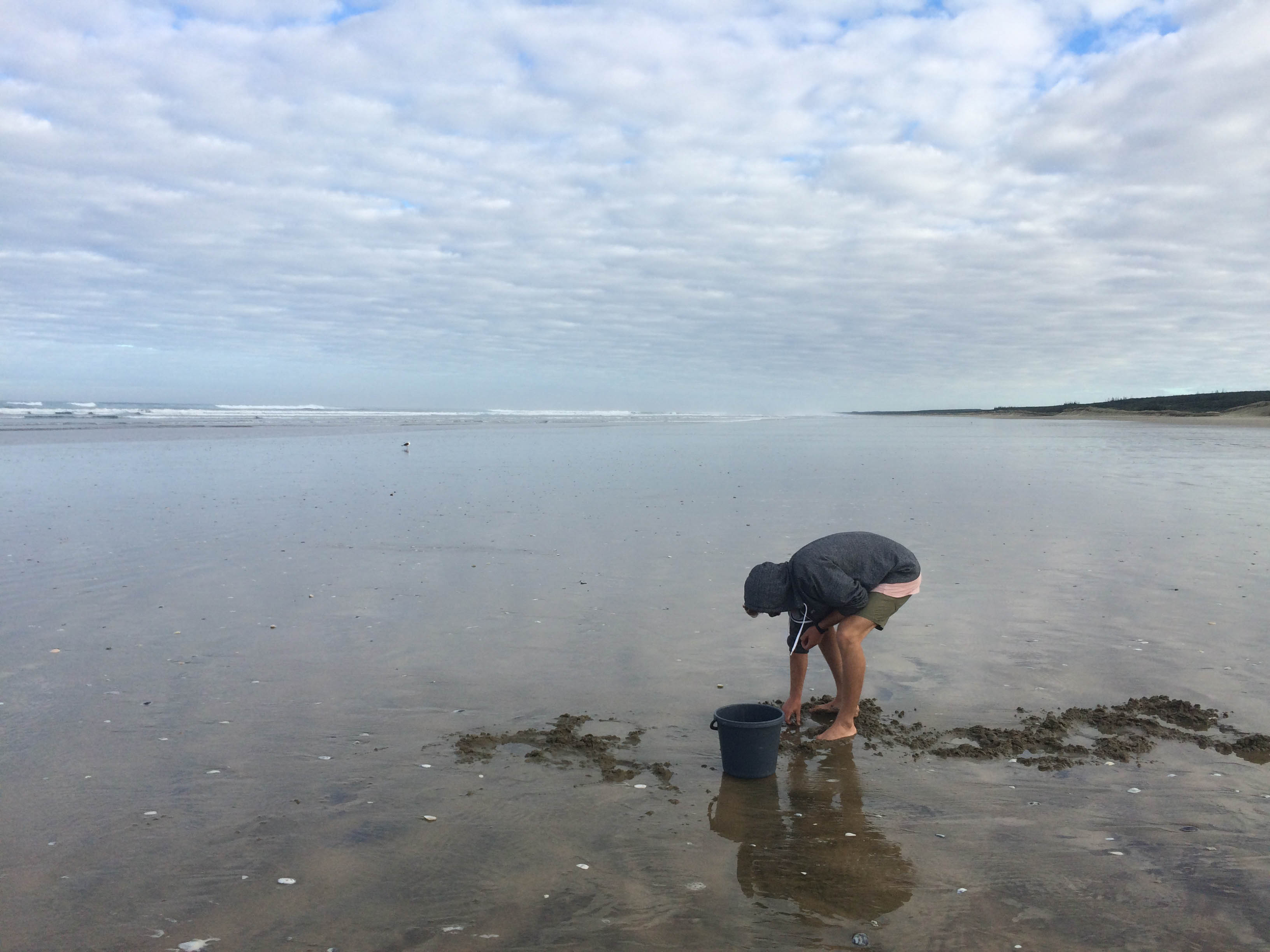 On our journey up north there was word on the street that there were tuatuas to be found along ninety mile beach. So after checking the tides to make sure the Corolla wouldn’t be swept out to sea we drove onto the beach at Waipapakauri on the hunt for tuatuas. Ten minutes in we thought would be the perfect spot for a bit of tuatua twisting – for those non kiwis reading, this action requires you to dig your heel into the sand and twist it about to find the tuatuas hiding in the sand. Wax informs me that they use to learn a song at school called ‘doing the tuatua twist’ – I can just imagine. Anyhow the spot we picked was teeming with the little suckers and within no time we had enough for dinner.