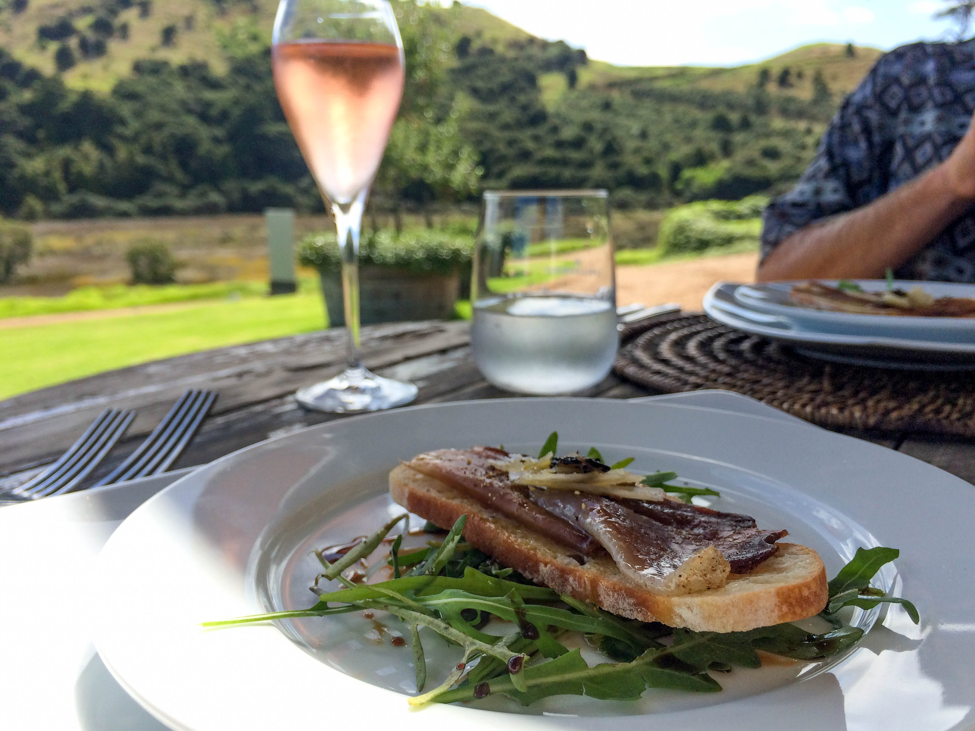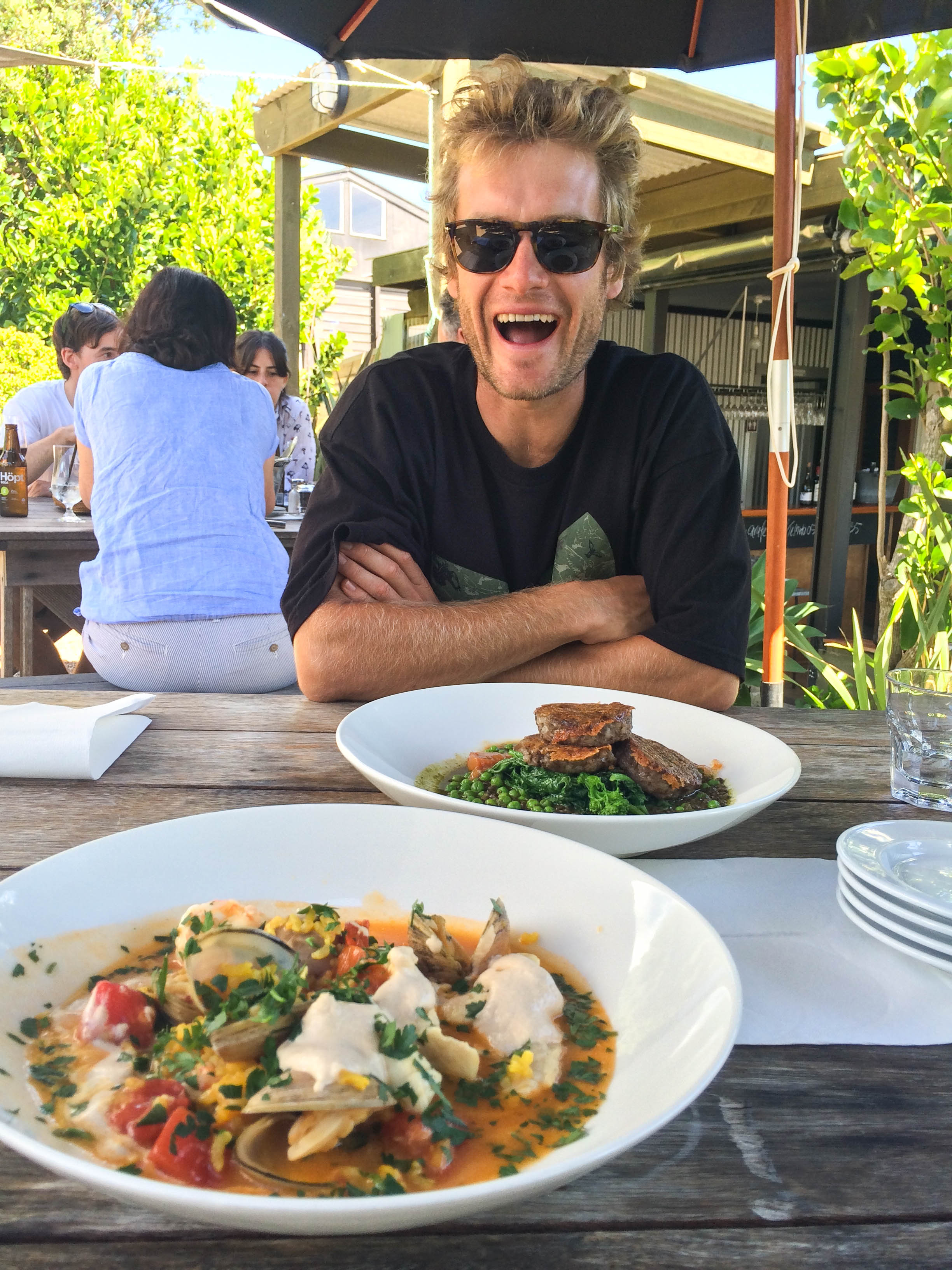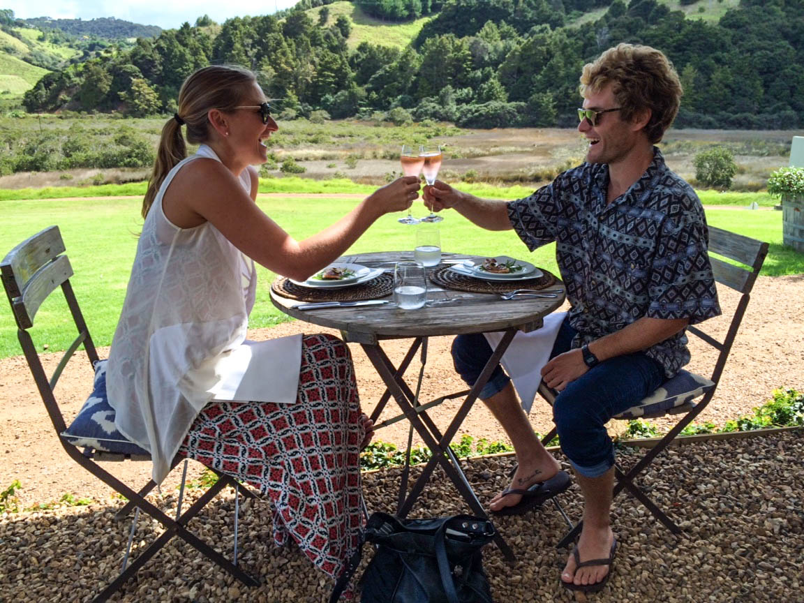 Jesse had organised a sweet pad for our stay at a place called Taraire Lodge, in Little Oneroa. It was only a 10 minute walk to the beach, the bus stop and the centre of Oneroa. Our first night was spent in a bar watching the world cup cricket final and what a win it was! The following day we decided to check out this Italian place that our mate had recommended – Poderi Crisci. And oh WOW. We were blown away by this little slice of Italy right here in NZ. Everything we ate was so fresh and tasty, the service was exceptional and friendly, the wine was delicious and the location stunning. We had a great afternoon here and it was a definite highlight of the trip. Over the next couple of day we ate at The Oyster Inn and Te Motu, they were both good but had nothing on Poderi Crisci.