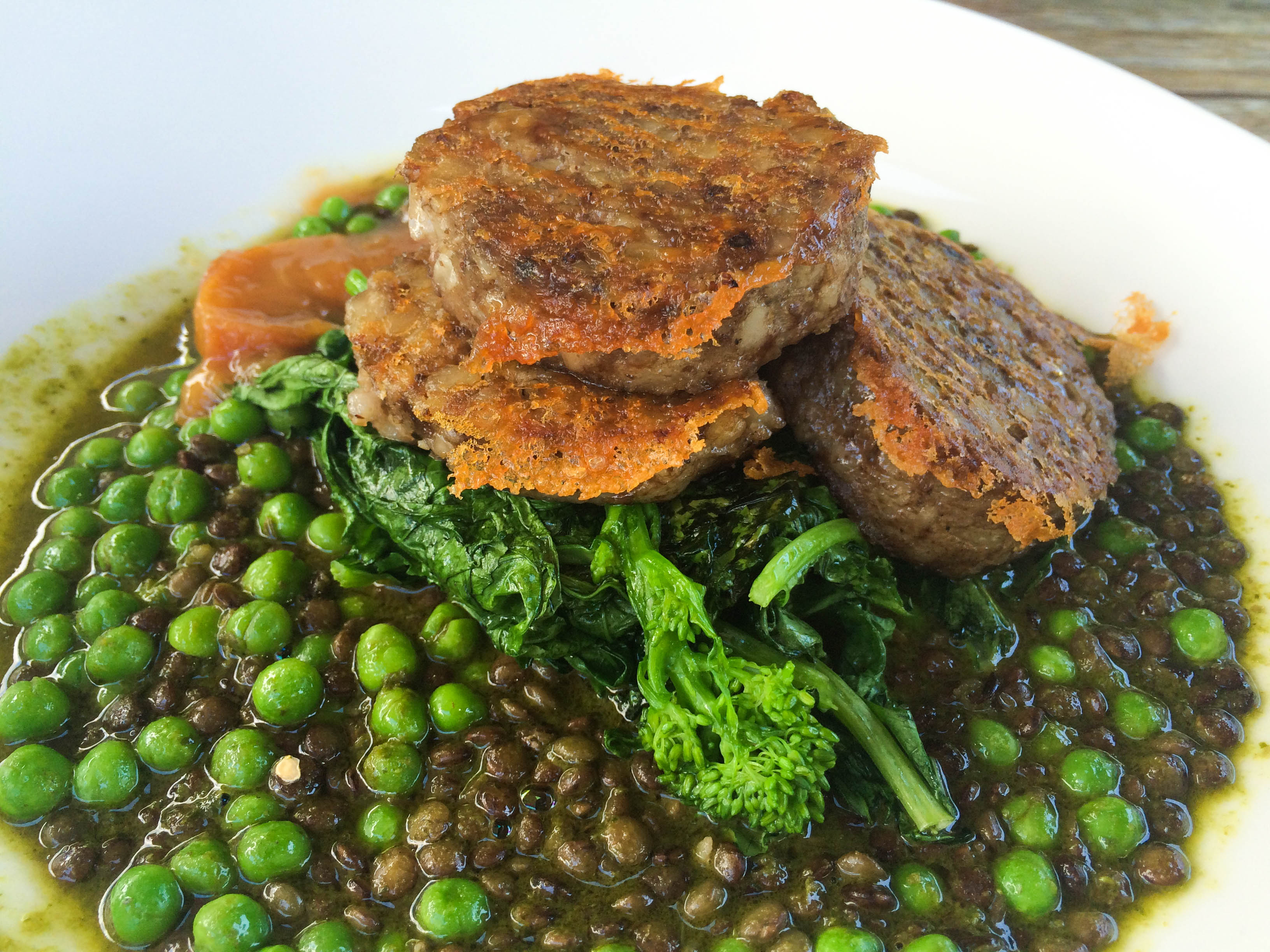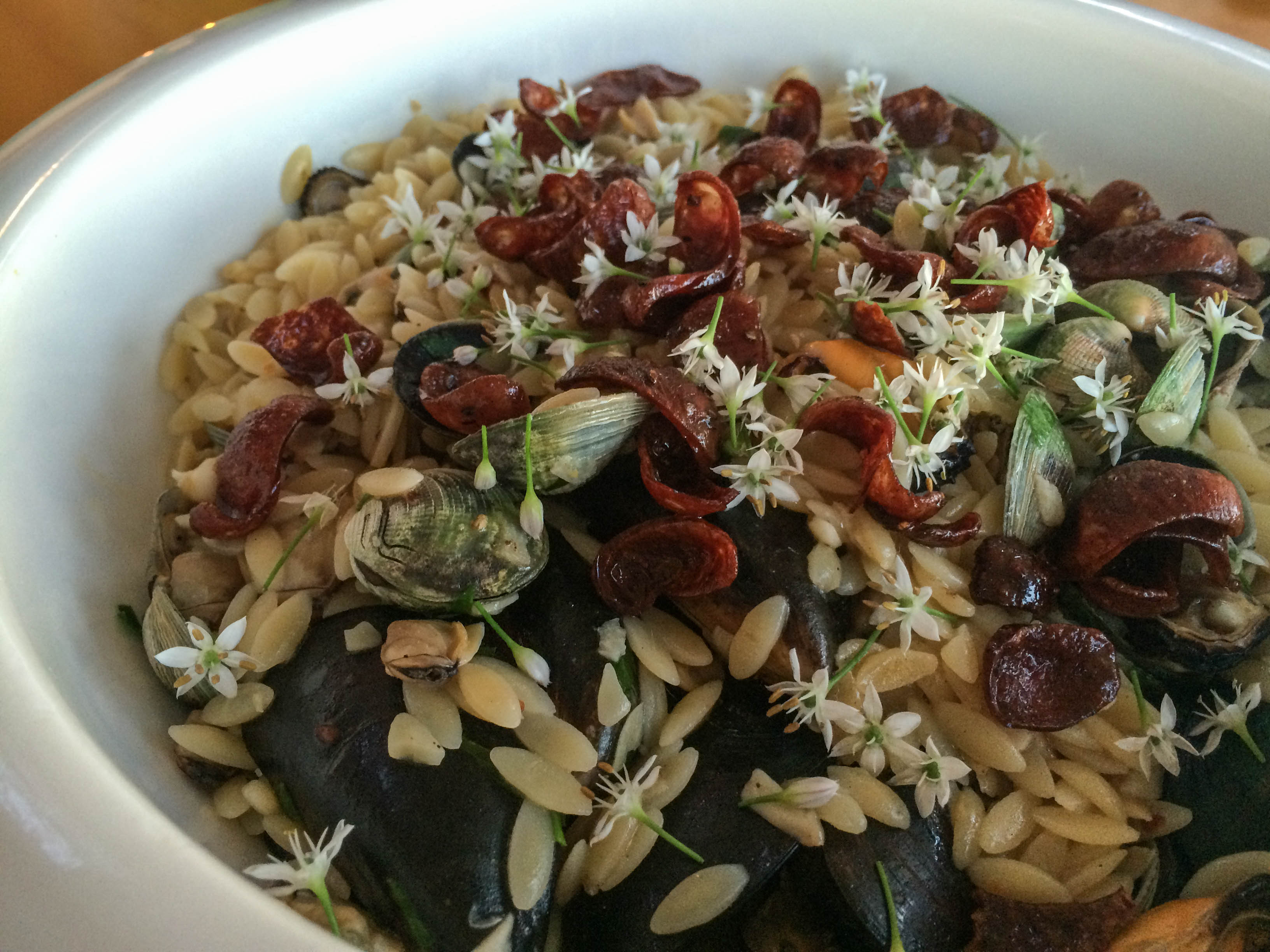 Put a large pot of salted water on to boil for the pasta. Meanwhile steam open 3/4 of the shell fish, reserve the juice and remove the cooked shellfish from their shells. Over a medium heat fry the pepperoni until it’s nice and crispy and reserve as garnish. Sauté the garlic in the butter and when it’s nice and golden add the wine and begin to reduce. Cook the rizoni until almost done, about 3 minutes less than the time recommended on the packet, drain and add to the pan with garlic, wine and the reserved shellfish, still in the shell. Finish the cooking like a risotto, stirring and adding leftover shellfish juice as the pasta absorbs the liquid. Cook for another 3-4 minutes and when the pasta is done stir through the oil, lemon juice and cooked shellfish meat. Season and garnish with crispy pepperoni and garlic flowers.